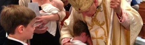 El cardenal Raymond Burke, quien acaba de bautizar a su hermano pequeño Damian y de dar la Primera Comunión a su hermano mayor Gregory y a otros niños en la basílica de Nuestra Señora de Guadalupe en La Crosse (Wisconsin, Estados Unidos), pasa junto a él y le pregunta a sus padres ….